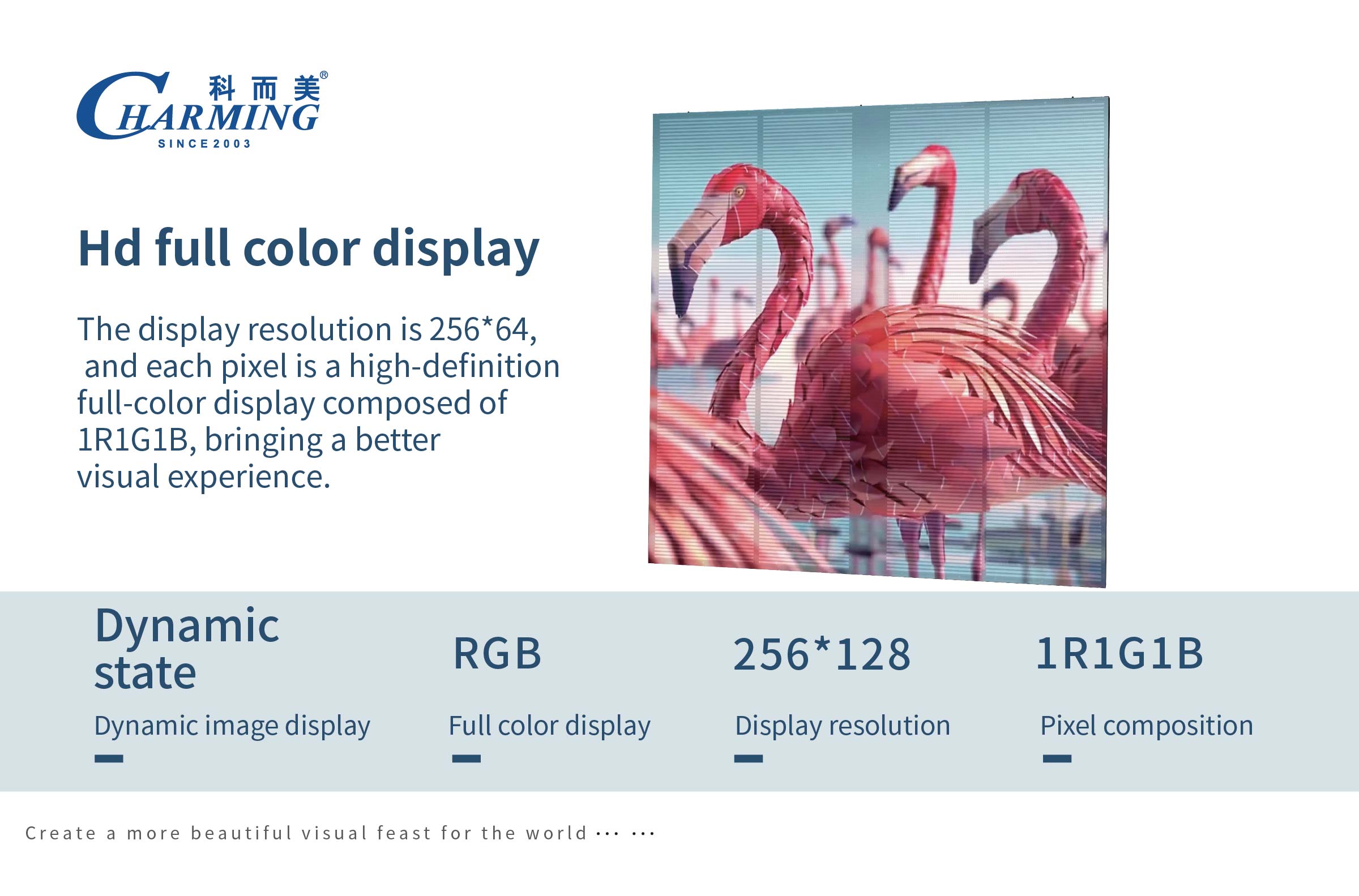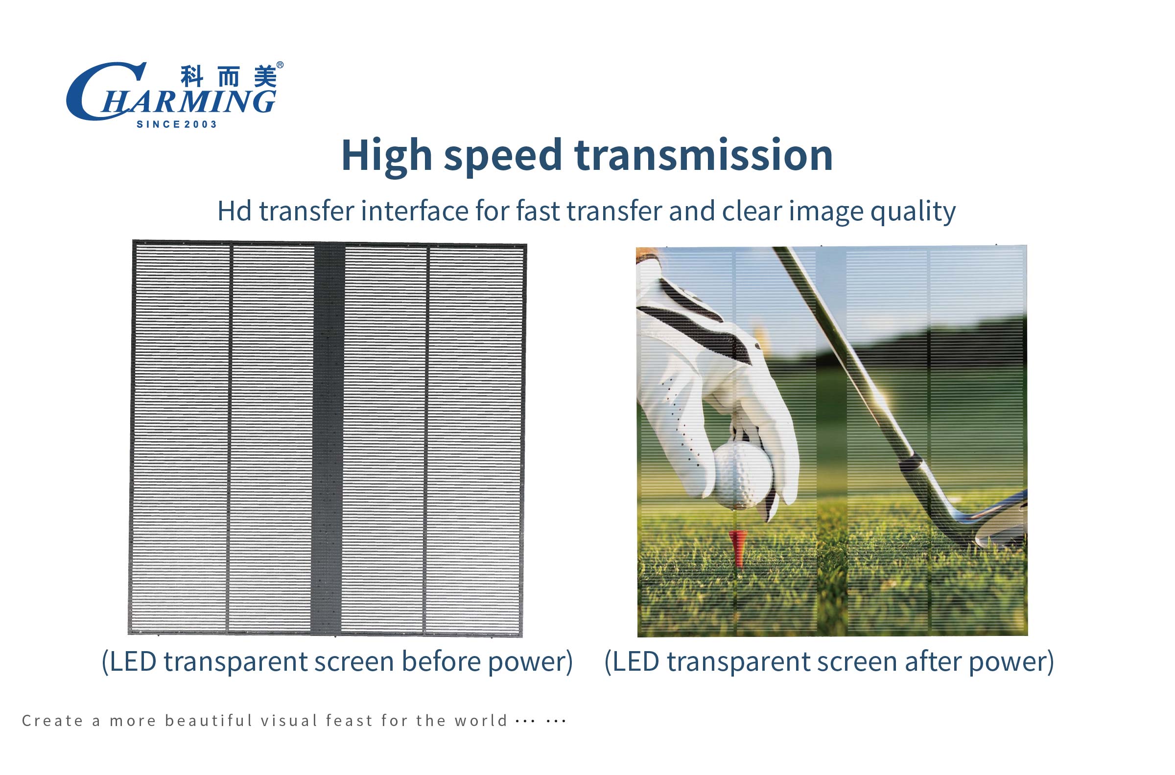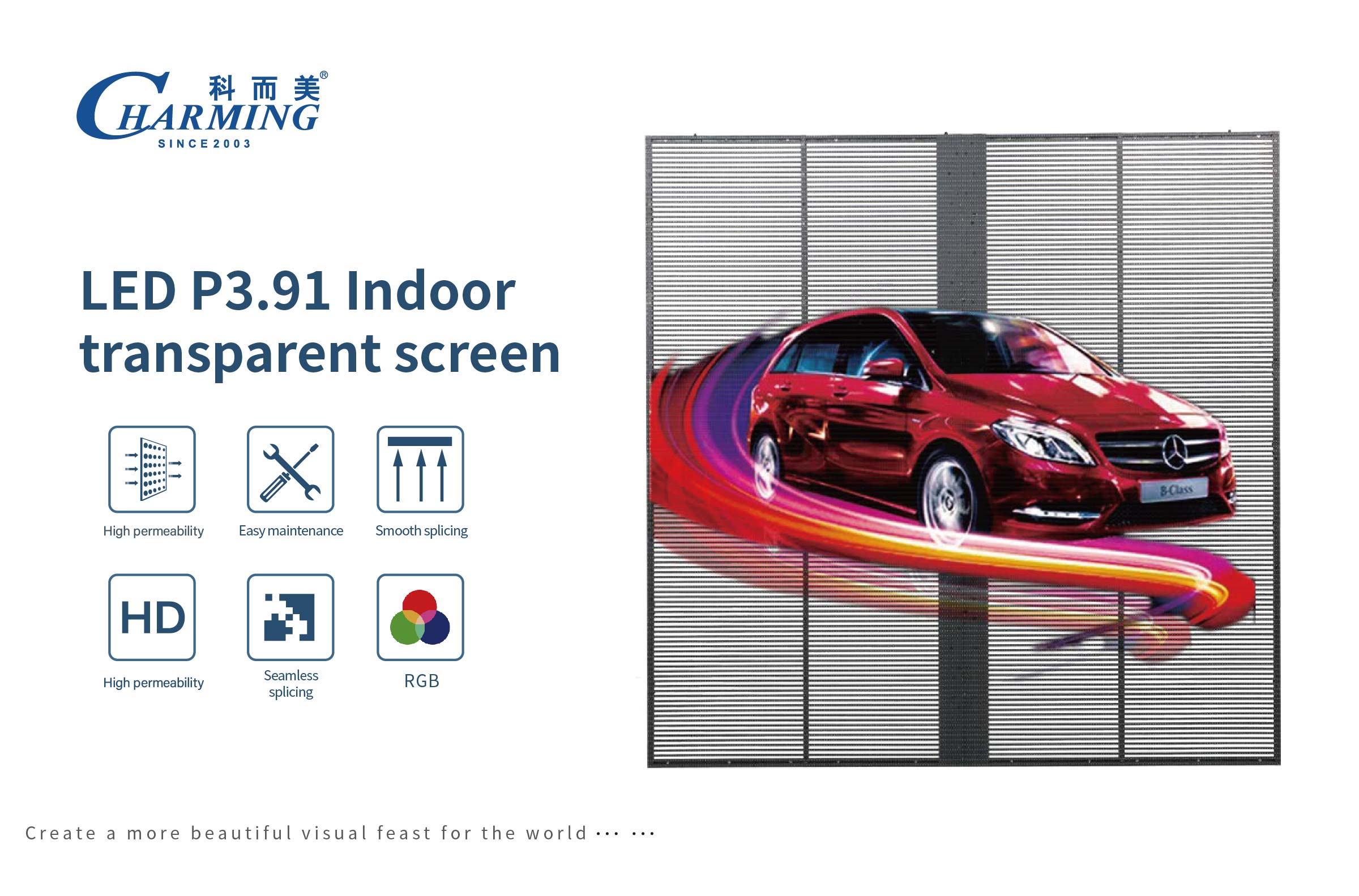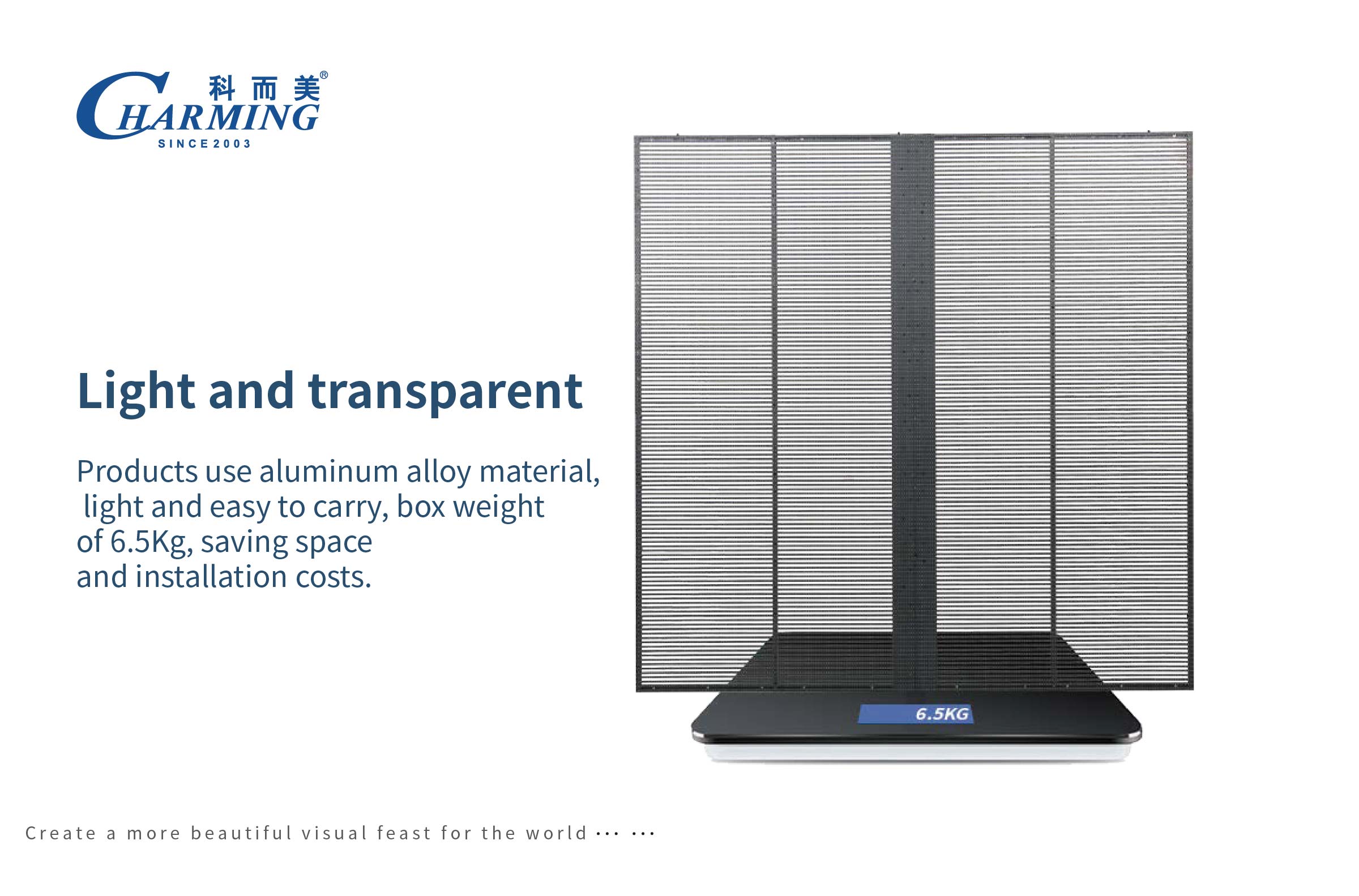 1.高通透率,专业设计箱体结构和尺寸,保透性达到55%,承重性能以及加固设计和一致性; 2.高清全彩显示,显示器分辨率为256 * 64,每个像素由1R1G1B组成的高清全彩显示器,带来更好的视觉体验; 3.轻薄通透,产品使用铝合金材料,轻薄易于携带,箱体重量为6.5Kg,节约空间和安装成本;