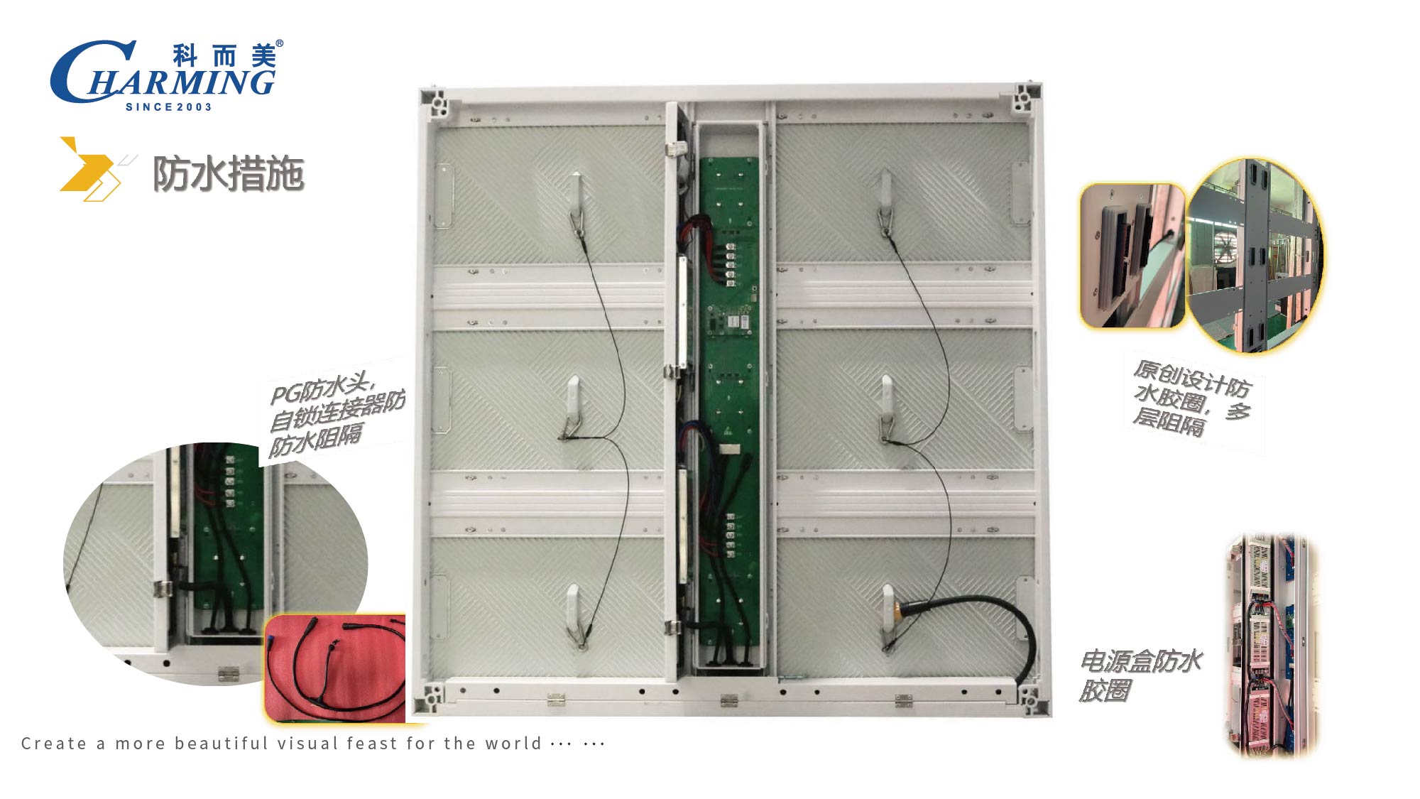 1.全铝底壳,燃点高,防火等级高,可经过TUV机构5VB防火测试认证 2.特殊设计防水胶圈,多层防水防护,防护等级可达IP65
