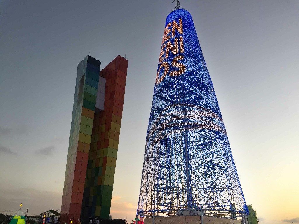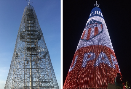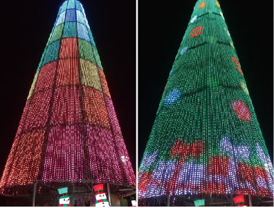 哥伦比亚圣诞树总高度37米,面积约1173平方米,建筑采用科而美LED点光源做装饰,点光源单个功率为1.44W,全彩显示,形成巨大的点阵屏幕效果,到了夜晚,点光源随着控制系统播放各种多彩画面,时而如音符跳动,时而如繁星闪烁,让游客体验一场另类的视觉盛宴。