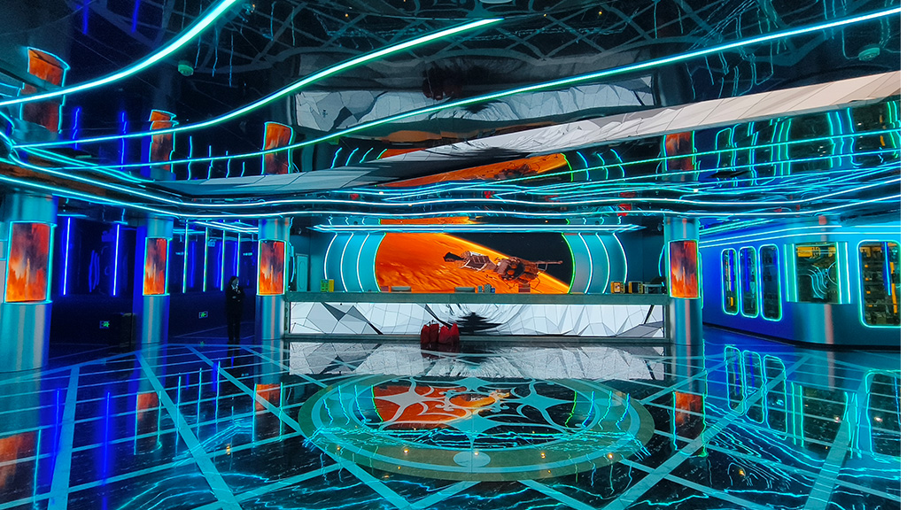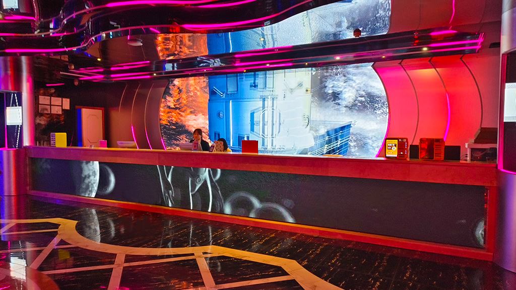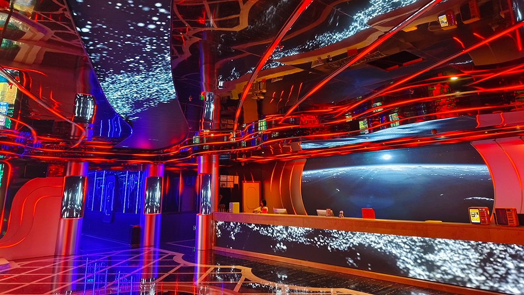 广州海豚音KTV采用了异形LED屏与灯带结合打造出一个充满科技感与活力的空间,这里LED屏幕与优美线条交织,打造出一种未来感十足的视觉体验。在灯光的映照下,整个空间显得更加迷人。柔和的灯光与LED屏幕的明亮色彩相互辉映,提供最佳的视觉享受。
