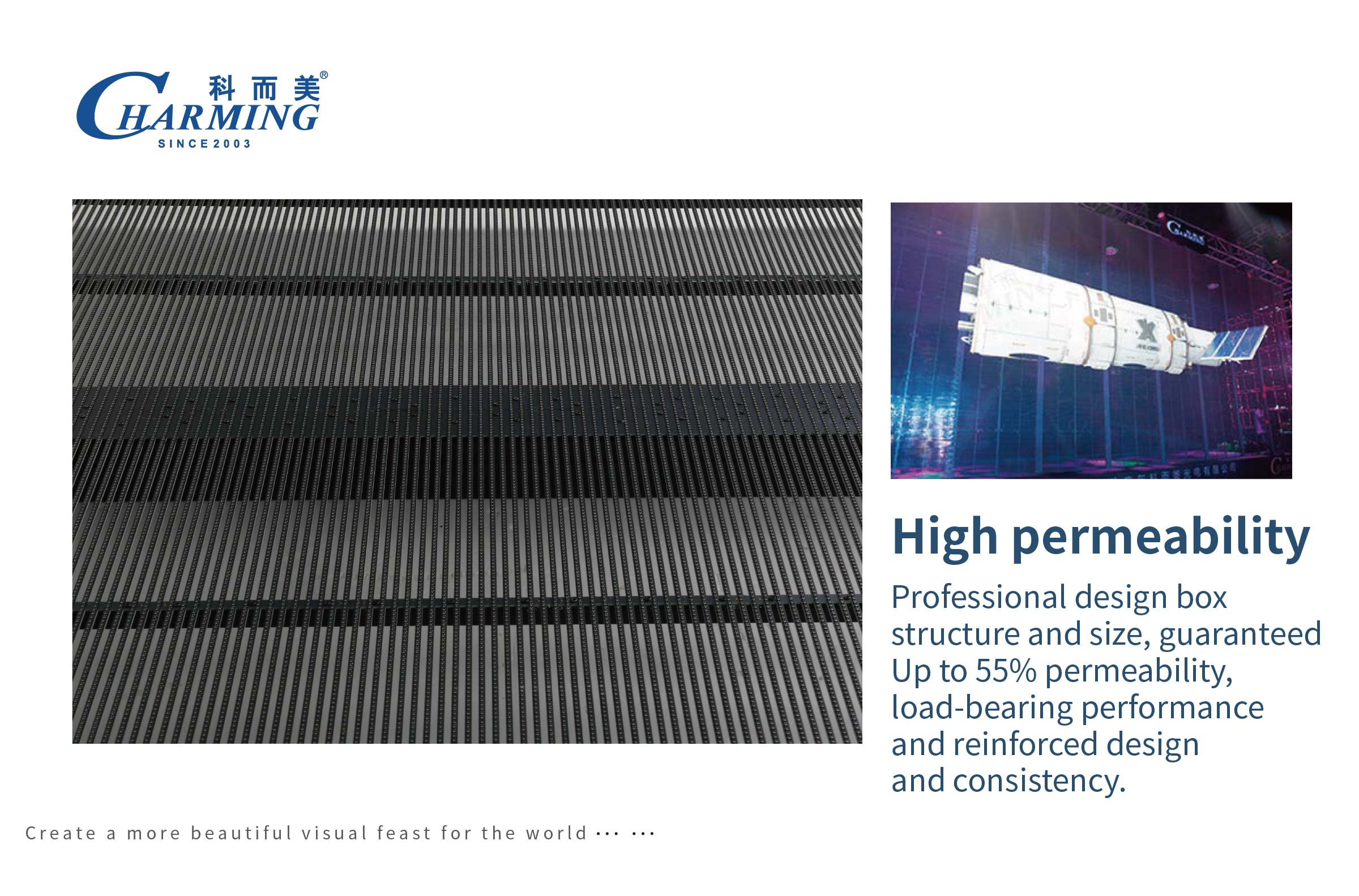 1.高通透率,专业设计箱体结构和尺寸,保透性达到55%,承重性能以及加固设计和一致性; 2.高清全彩显示,显示器分辨率为256 * 64,每个像素由1R1G1B组成的高清全彩显示器,带来更好的视觉体验; 3.轻薄通透,产品使用铝合金材料,轻薄易于携带,箱体重量为6.5Kg,节约空间和安装成本;