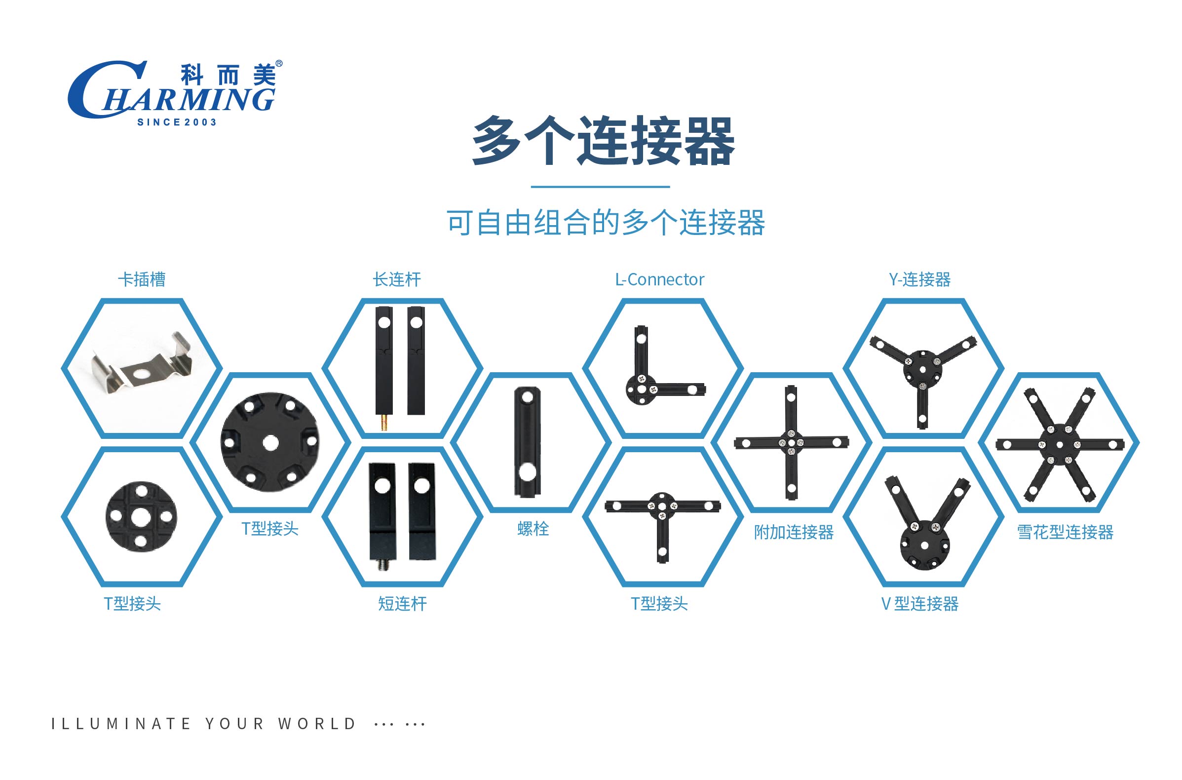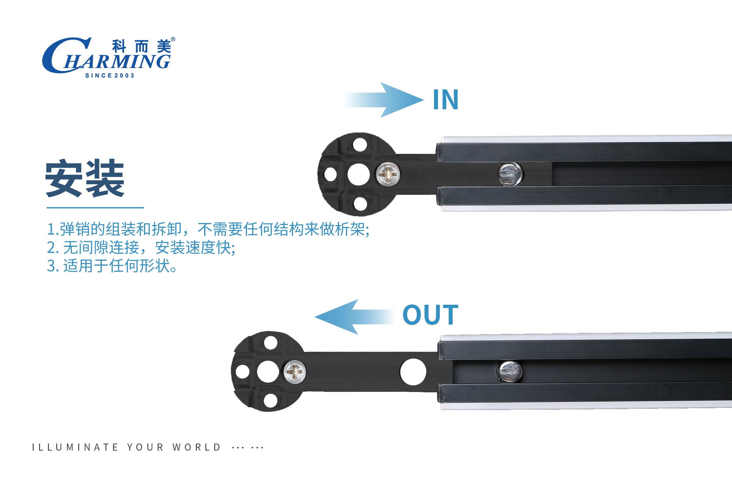 1.无需安装支架,灯条本身刚性强,可通过连接器直接安装。包括各种形状和各种几何形状的安装; 2.弹销的组装和拆卸,不需要任何结构来做析架;无间隙连接,安装速度快,并且适用于任何形状;