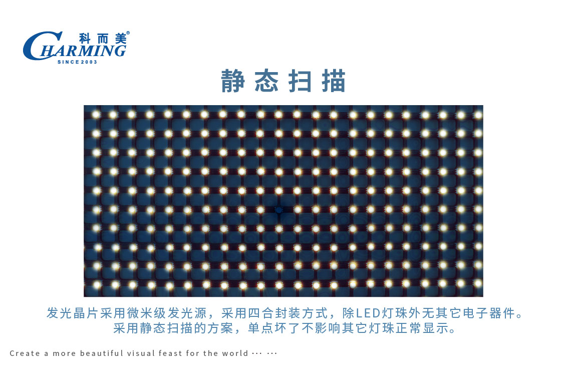 1.发光晶片采用微米级发光源,采用四合封装方式,除LED灯珠外无其它电子器件。采用静态扫描的方案,单点坏了不影响其它灯珠正常显示;
